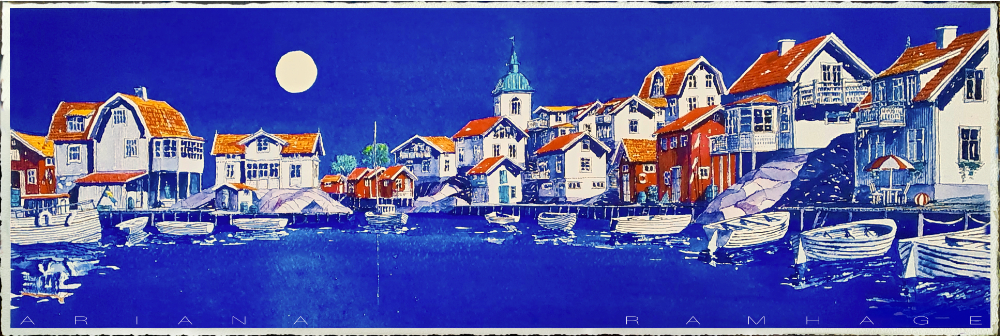 Fullmånen lyser upp de gamla trähusen och speglar sig i den stilla kanalen. Man kan nästan känna lugnet som lagt sig över hamnen.