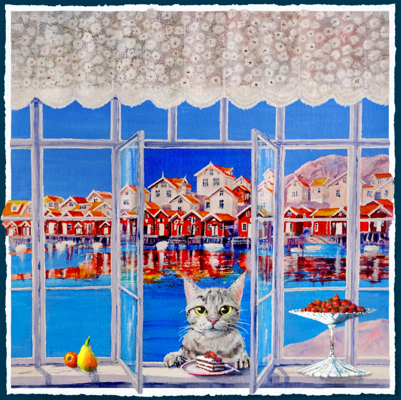 I det här motivet är det vi som befinner oss inne i värmen och blickar ut. Genom fönstret, delvis inramat av en skir spetsgardin, möter vi en oväntad besökare: en nyfiken katt som rest sig på bakbenen för att kika in till oss. På fönsterbrädan framför oss står en tårta kvarlämnad, som ett löfte om en fest som pågår alldeles i närheten.