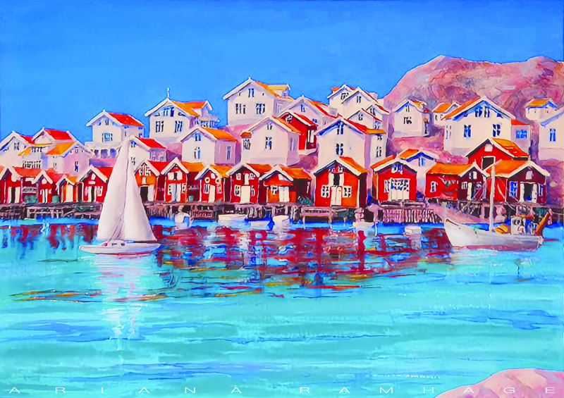 Målningen domineras av det ”blåaste blå” havet och himlen, som kontrasterar vackert mot de varma färgerna hos de tätt packade sjöbodarna och husen som klättrar uppför den bohuslänska graniten.