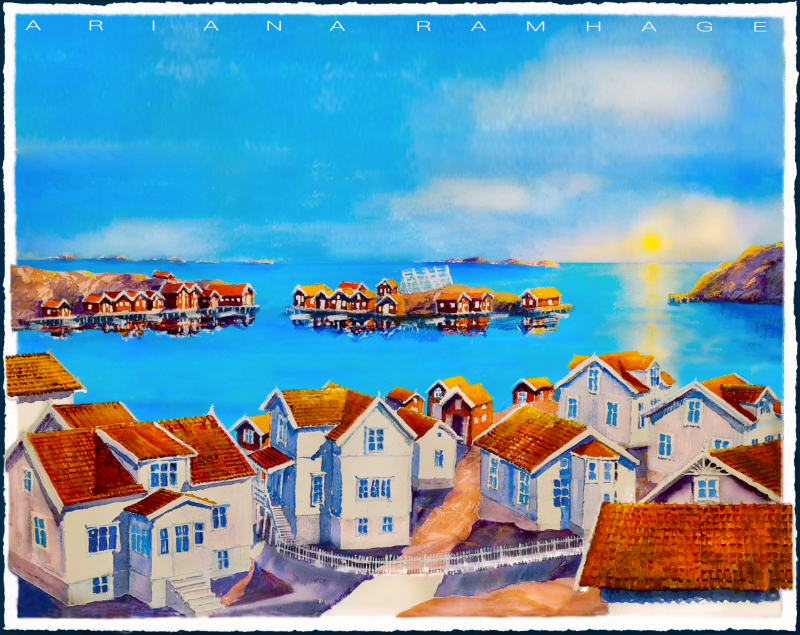Målningen fokuserar på det varma mötet mellan de ljusa skärgårdsvillorna och de klassiska sjöbodarna som kantar vattenbrynet.