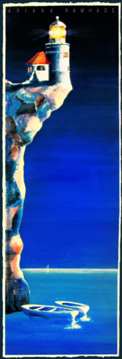 De små båtarna som vilar vid klippans fot tillför en mänsklig närvaro och en känsla av ro i det storslagna landskapet. Målningen fångar den speciella atmosfären när kusten går till vila men fyren troget fortsätter att visa vägen.