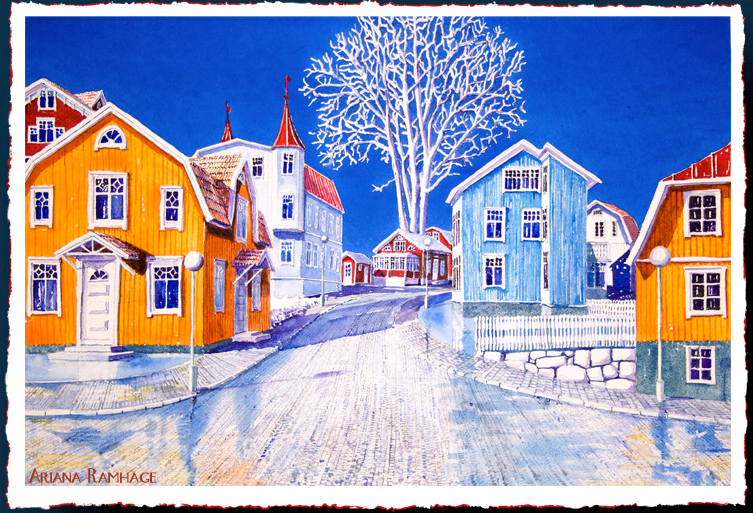 Ariana Ramhage lyckas här fånga den krispiga känslan av nysnö och det speciella ljus som bara uppstår en gnistrande vinterdag. En perfekt tavla för alla som har en särskild plats i hjärtat för Lerums historiska miljöer och vill pryda väggen med lokal konst som sprider både värme och lugn.