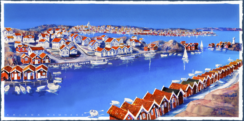 Detta konstverk fångar den unika atmosfären längs bryggorna där de ikoniska röda sjöstugorna står på rad mot den karga bohuslänska graniten.