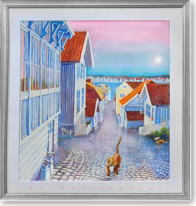 I ”Marskatter på Marstrand” får de fyrbenta invånarna ta plats i förgrunden på den blanka kullerstenen, vilket ger motivet en levande och personlig karaktär. Bakom dem sträcker sig de klassiska trähusen med sina vackra glasverandor upp mot en himmel färgad av solnedgångens mjuka rosa och violetta toner.