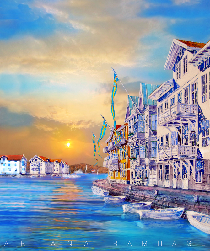 Fånga magin i en svensk sommarkväll med detta vackra motiv från Marstrand. Målningen skildrar den klassiska vyn mot Hedviksholmen, där solen sänker sig vid horisonten och färgar himlen i varma toner av guld och mjukt blått. De ikoniska vita trähusen med sina snickarglädjade balkonger och de vajande svenska flaggorna skapar en tidlös känsla av havsliv och tradition.