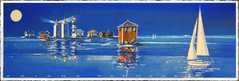I det här motivet har jag velat fånga den trygga och vägledande känslan som ljuset från tornen sprider över det mörka vattnet.