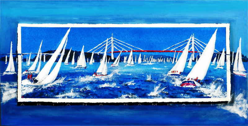 Produktbeskrivning ”Regatta” är en storslagen hyllning till ett av de mest ikoniska ögonblicken på den svenska västkusten – den intensiva tävlingen Tjörn Runt. I detta panoramaverk fångas den elektriska atmosfären när hundratals segel möts under Tjörnbron, som sträcker sig som en majestätisk portal över det djupblå vattnet. Genom skickliga penseldrag förmedlas känslan av de vita seglen som fylls av vinden och båtarna som klyver vattenytan i en harmonisk men kraftfull dans.